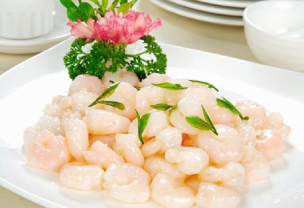 龙井茶叶素以“色绿、香郁、味甘、形美”四绝著称。河虾(即青虾)被古人誉为“馔品所珍”,不仅肉嫩鲜美,营养丰富,且有补肾、壮阳、解毒之功效。取用清明前的龙井新茶与时鲜的河虾烹制的“龙井虾仁”,色如翡翠白玉,透出诱人的清香,食之极为鲜嫩,是一道具有浓厚地方风味的杭州传统名菜。