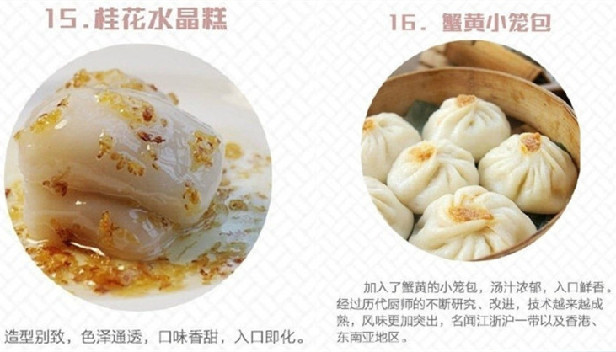 桂花鲜栗羹,幸福双,百果油包,松丝汤包,油氽馒头,银丝卷,虾爆鳝面,片儿川面,